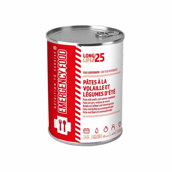 La pasta al pollo e alle verdure estive di Emergency Food, elaborata in Francia da Falières Nutrition, è una soluzione di pasto equilibrato e durevole per le situazioni d'emergenza, con una durata di conservazione di oltre 25 anni.