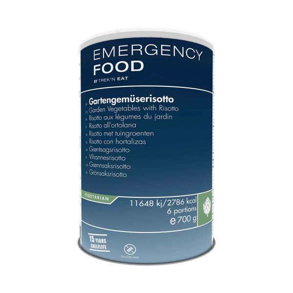 Questa scatola da 700 g, che contiene circa 6 porzioni di risotto alle verdure dell'orto, si conserva 15 anni senza apertura dopo la data di produzione. Numerose organizzazioni di aiuto internazionale e unità speciali dell'esercito utilizzano questi prodotti.