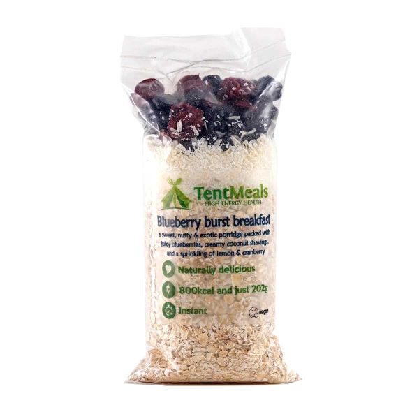 La colazione al Mirtillo del marchio TentMeals è un piatto disidratato che sta in una mano e pesa 208 g prima della reidratazione. Dopo reidratazione con 400-500 ml di acqua otterrete una porzione generosa da consumare da soli o in due per iniziare bene la giornata prima del trekking, trail in autonomia, escursione...